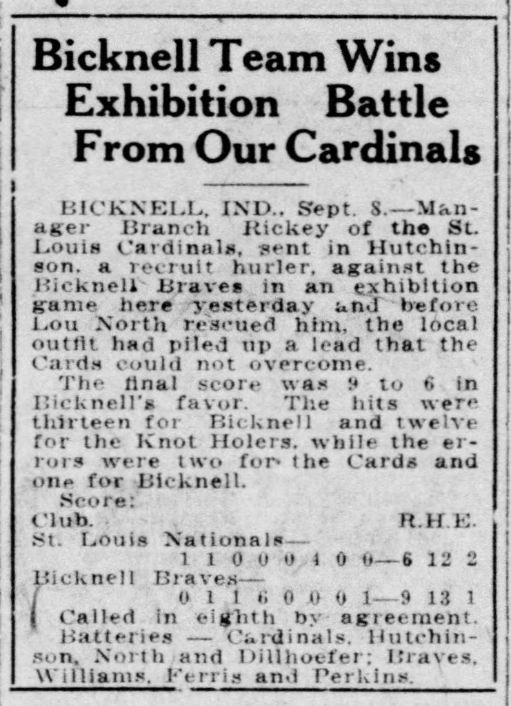 One highlight of his baseball career undoubtedly was playing against the St. Louis Cardinals. The major-league club filled two open dates in their schedule with games at Bicknell and Greensburg, Indiana, on September 7, 1921. Although a detailed box score could not be located online, Tipton reportedly played in the exhibition game for the Bicknell Braves, an independent club that played northeast of Vincennes. The Braves had 13 hits off Hutchinson (an unsigned rookie trying out) and Lou North and beat the Cards in eight innings, 9-6. Future Hall of Famer Rogers Hornsby was hitless in the game.